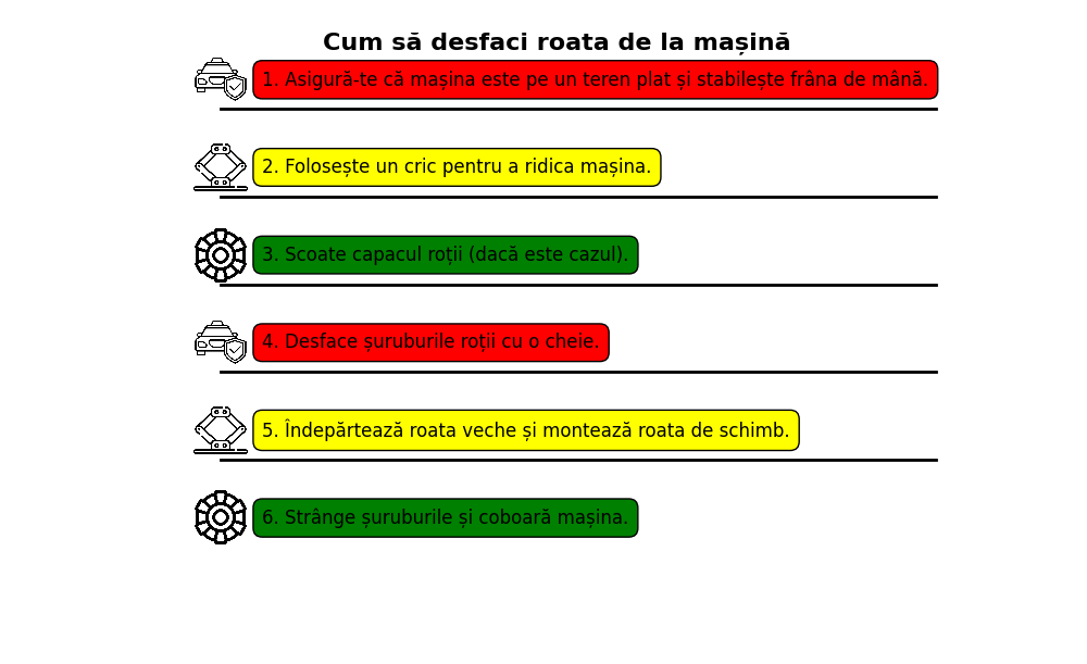 Pregătirea Mașinii: Asigură-te că mașina este parcată pe o suprafață plană. Ridică mașina cu un cric și asigură-te că este stabilizată corect.